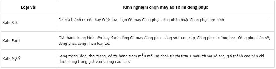– Kate Silk: Là loại vải dùng chủ yếu để may sơ mi học sinh. Thành phần PE cao nên có độ bền màu rất cao, độ bền của vải cao, rất ít nhăn, giá cả tốt rất phù hợp cho sinh viên, học sinh, tạp vụ, công nhân, áo đoàn. Nhược điểm là thấm hút mồ hôi kém, mặc nóng hơn các loại Kate khác phía trên. May đồng phục cho học sinh thì chắc nhắn 90% sẽ chọn chất liệu này vì giá cả hợp lý đối với học sinh và chất lượng cũng chấp nhận được.